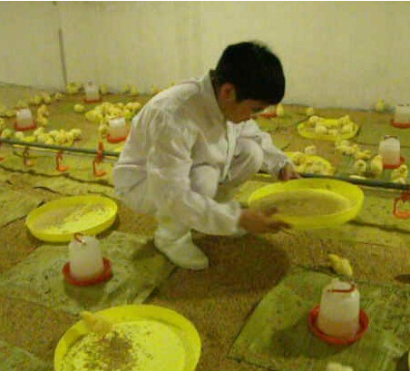 開食的辦法是將雞食撒于塑料布或舊報(bào)紙上,放于小雞常出沒的地方,且可撒部分料于小雞的頭背上,誘之啄食,如此調(diào)教幾次,雛雞即很快學(xué)會(huì)采食。