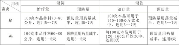 【主治】防治豬支原體性肺炎(氣喘病)引起的病豬咳嗽、氣喘、呼吸困難、消瘦、生長(zhǎng)遲緩、飼料轉(zhuǎn)化率降低;防治副豬嗜血桿菌病、鏈球菌病引起的病豬咳嗽、呼吸困難、消瘦、皮膚蒼白、關(guān)節(jié)腫大、跛行;防控豬呼吸道疾病綜合癥;防治呼吸道的混合感染;對(duì)豬增生性腸炎。ɑ啬c炎)有很好的治療作用;防治仔豬斷奶后多系統(tǒng)衰竭綜合癥;對(duì)豬密螺旋體引起的腹瀉、糞便帶血、久泄不止有很好的防治作用;防治禽慢性呼吸道病導(dǎo)致的病禽咳嗽、噴嚏、呼吸道啰音等